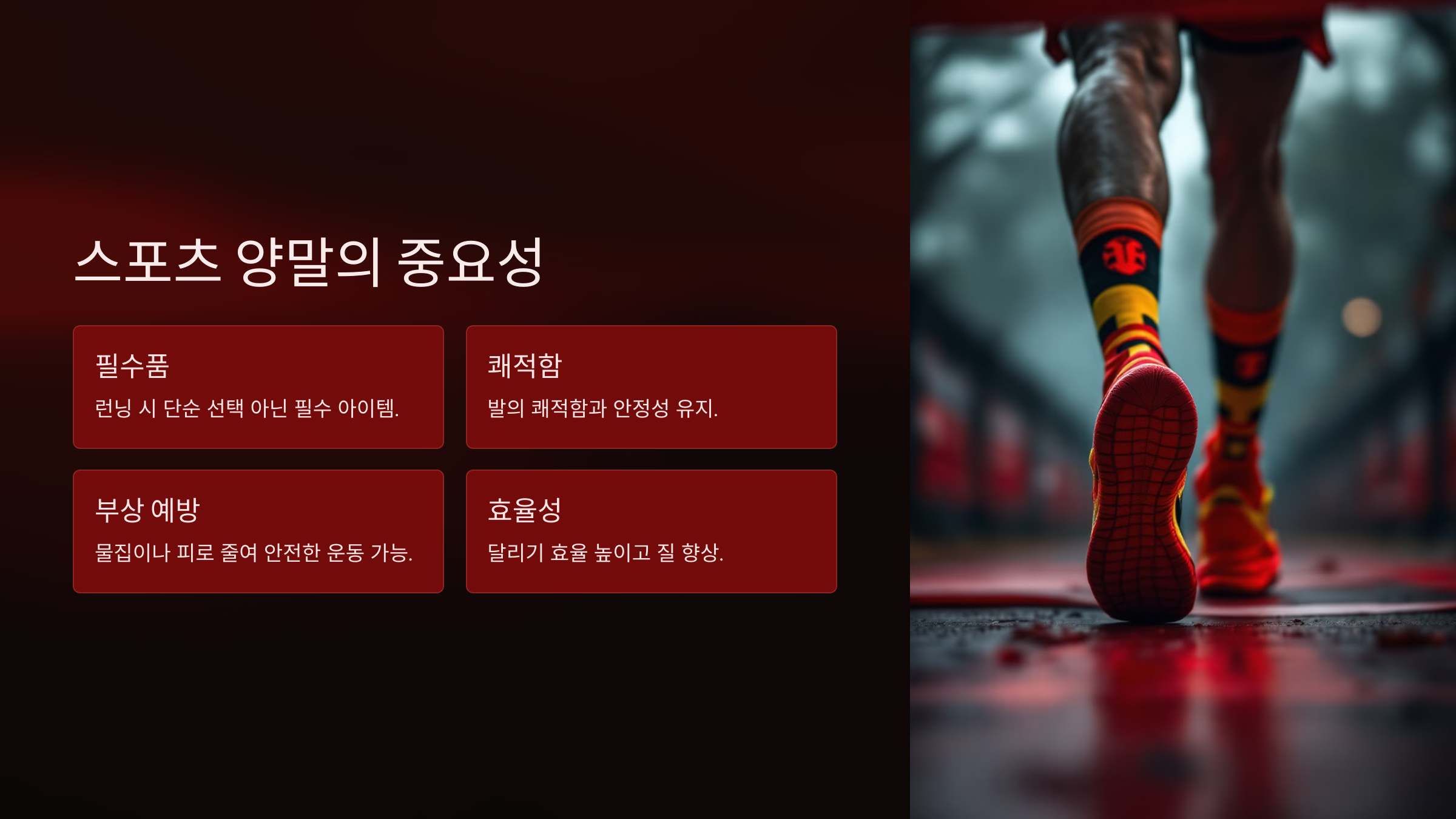 런닝할 때 스포츠 양말은 단순한 선택이 아닌 필수라고 할 수 있습니다. 발의 쾌적함과 안정성을 유지하며, 물집이나 피로를 줄여줍니다. 장시간 런닝을 계획 중이거나 발에 민감한 분이라면, 스포츠 양말의 중요성을 간과하지 말아야 합니다. 제대로 된 스포츠 양말을 착용함으로써 달리기의 효율을 높이고, 안전하게 운동을 즐길 수 있습니다.