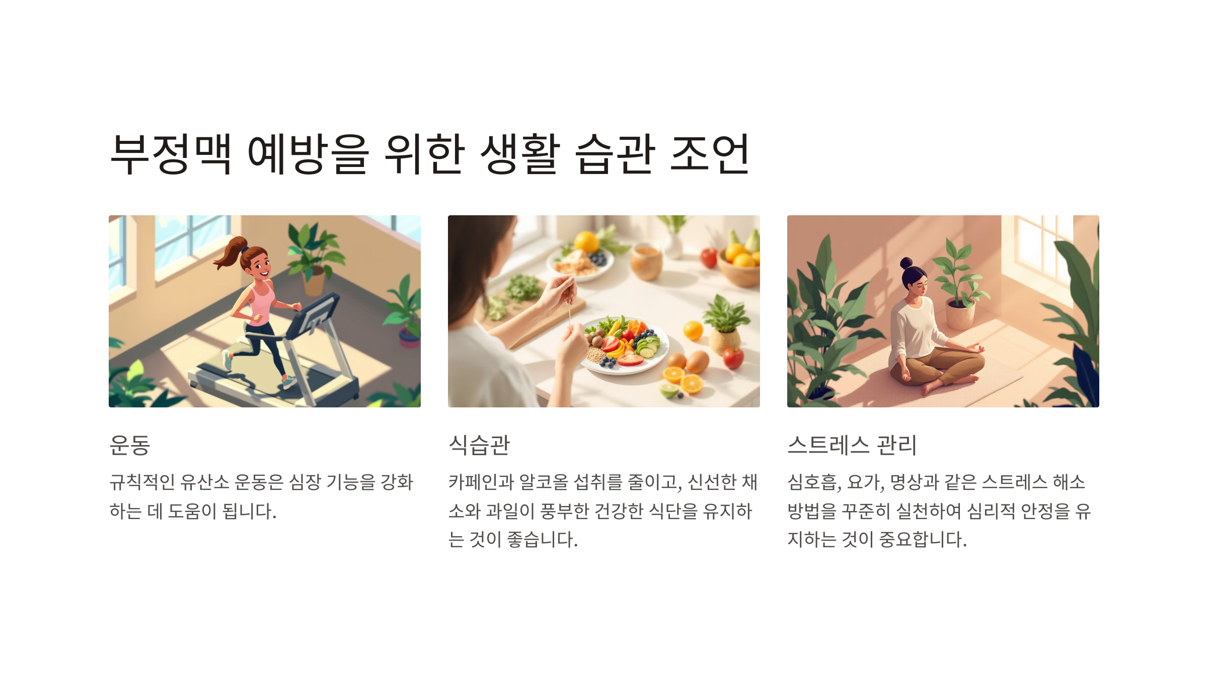 - 적절한 운동: 규칙적인 유산소 운동은 심장 기능을 강화하여 부정맥 예방에 도움이 됩니다.