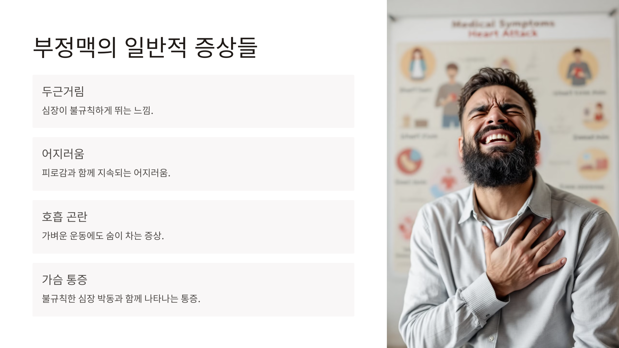 - 호흡이 가쁘거나 가슴 통증을 자주 느끼나요? 이런 증상은 부정맥 가능성을 시사할 수 있습니다.