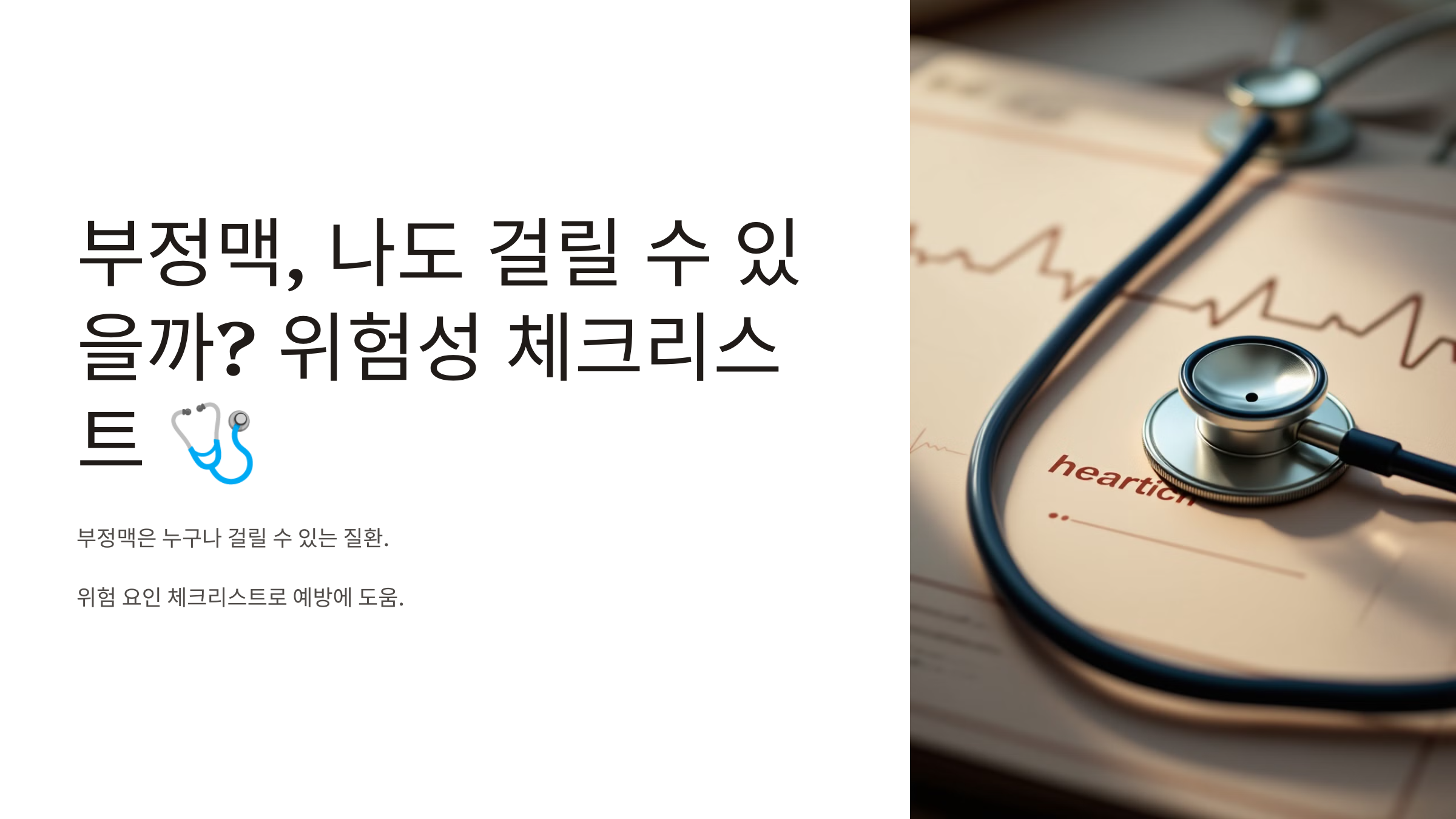 부정맥은 누구에게나 발생할 수 있지만, 그 위험을 미리 확인하고 생활 습관을 개선하는 것만으로도 예방할 수 있습니다. 체크리스트를 통해 자신의 상태를 파악하고 필요한 경우 의료 전문가의 도움을 받아 건강한 심장을 유지하세요. 부정맥 예방은 작은 변화에서 시작됩니다.💪