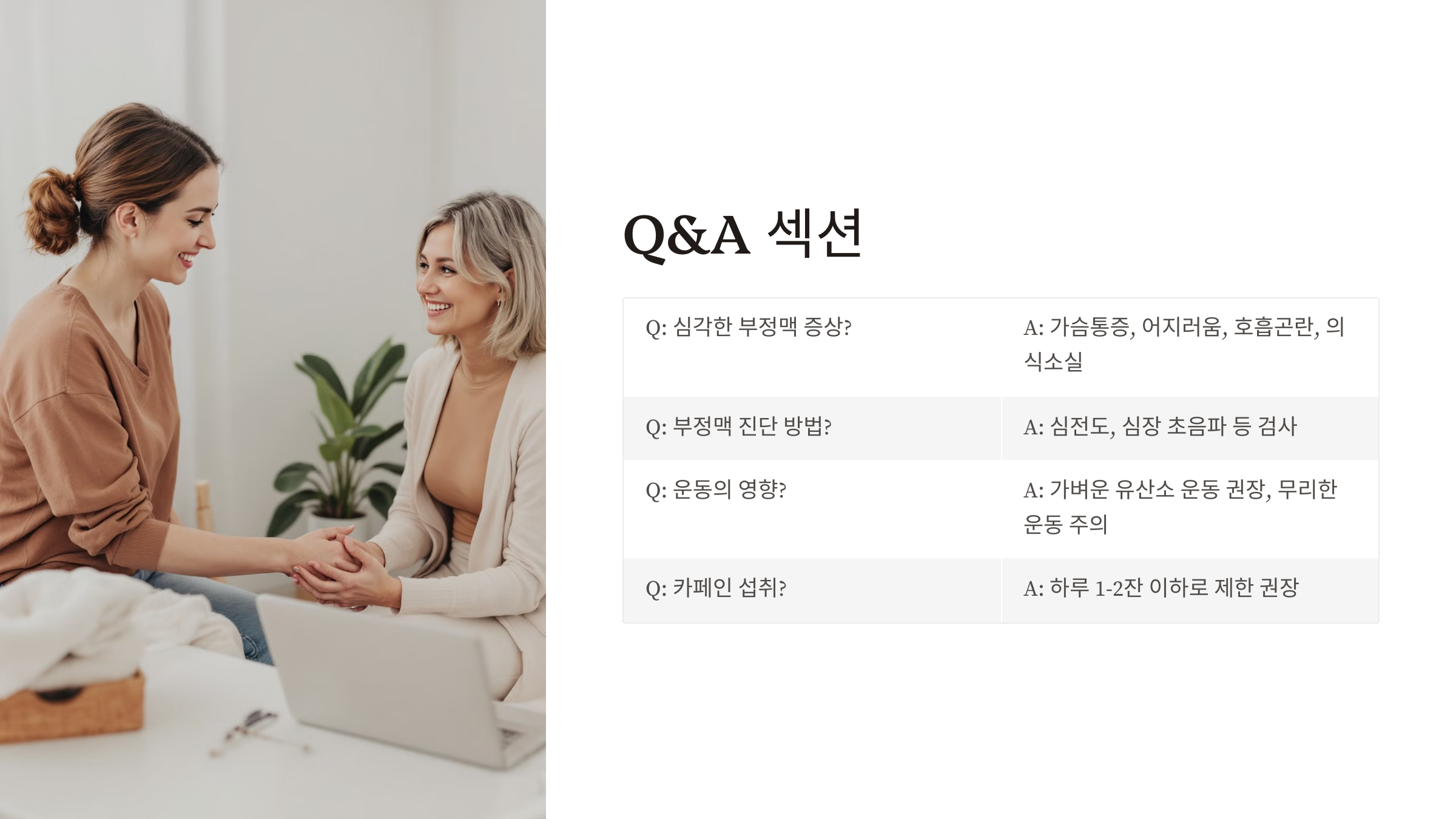 A1: 심각한 부정맥은 가슴 통증, 심한 어지러움, 호흡 곤란, 의식 소실 등의 증상이 동반될 수 있으며, 즉각적인 치료가 필요합니다.
