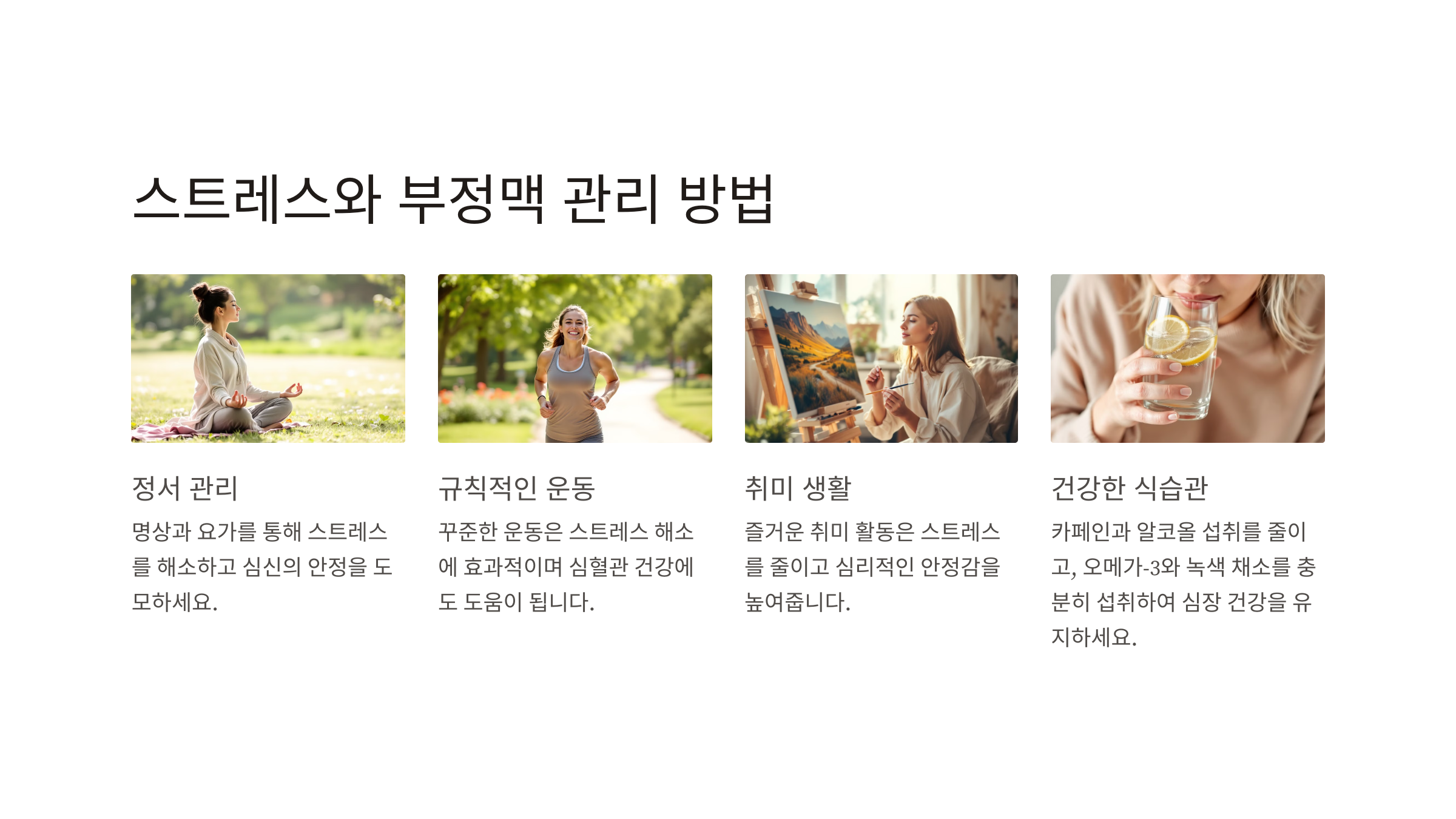스트레스를 줄이는 것은 부정맥 예방의 핵심입니다. 다음과 같은 방법들이 효과적입니다: