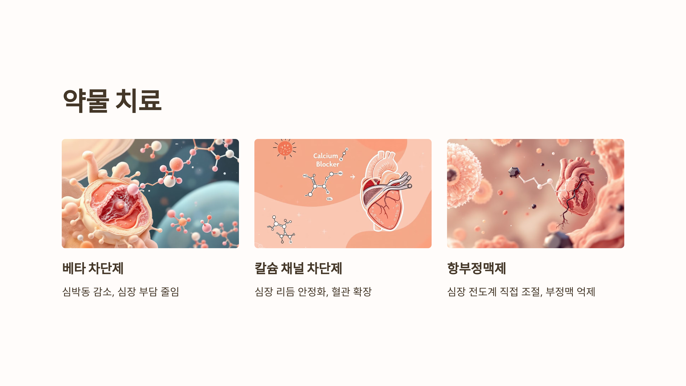 - 베타 차단제: 교감신경의 작용을 억제하여 심박동을 감소시키고, 심장의 부담을 줄여줍니다. 특히 스트레스나 운동 시 발생하는 부정맥 조절에 효과적입니다.