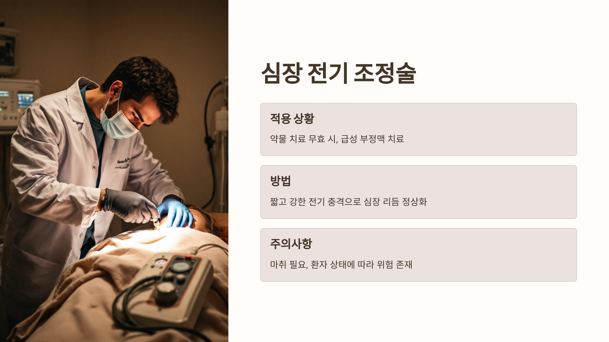 급성 부정맥의 경우, 빠르고 강력한 치료가 필요할 수 있습니다. 이럴 때 사용하는 치료법이 심장 전기 조정술, 흔히 말하는 전기충격 요법입니다. 전기충격 요법은 심장에 짧고 강한 전기 충격을 가하여 비정상적인 전기 신호를 정상적인 리듬으로 되돌리는 방법입니다.