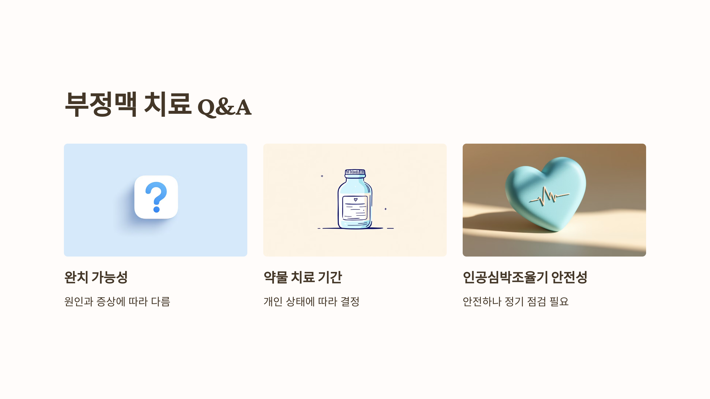 이러한 생활습관 개선은 부정맥의 빈도를 줄이고, 약물 치료와 병행할 경우 더 큰 효과를 기대할 수 있습니다.