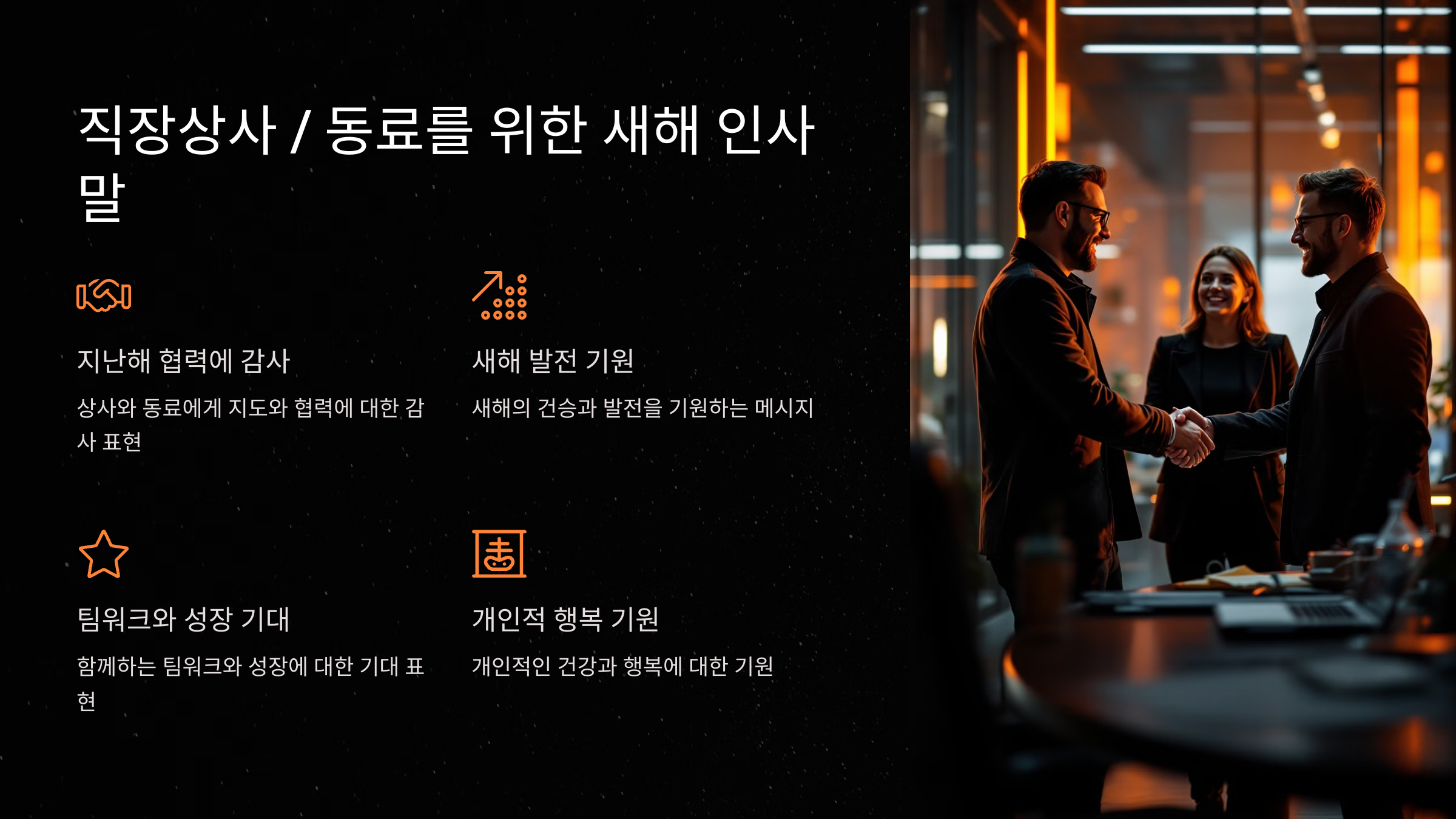 2025년 새해맞이 직장상사 인사말 추천. 대표님, 부장님, 팀장님, 이사님 등 다양한 직급별 새해 인사와 함께 업무 적 예의를 갖춘 권위 있는 인사말을 소개합니다. 정중하고 진정성 있는 새해인사 작성 노하우를 알려드립니다.