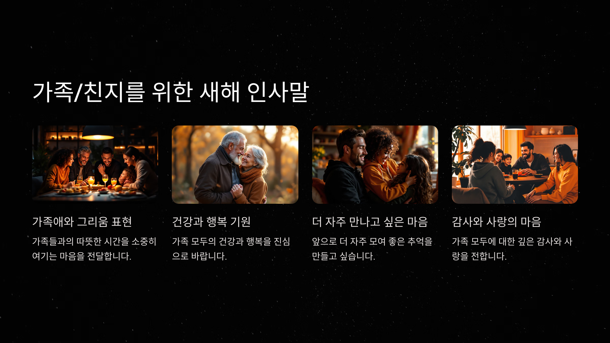- "사랑하는 우리 가족에게, 2024년의 마지막 페이지를 넘기고 희망찬 2025년을 맞이했습니다. 지난 한 해 동안 우리 가족 모두가 각자의 자리에서 최선을 다하며 서로를 응원하고 지지해주었기에, 모든 순간이 의미 있고 따뜻했습니다. 새해에는 우리 모두의 건강과 행복이 더욱 충만하기를 바랍니다. 특히 올해는 더 자주 모여 좋은 추억을 만들고, 서로의 이야기에 귀 기울이는 시간을 가졌으면 좋겠습니다. 우리 가족 한 사람 한 사람의 꿈과 희망이 모두 이루어지는 축복된 한 해가 되기를 진심으로 기원합니다."